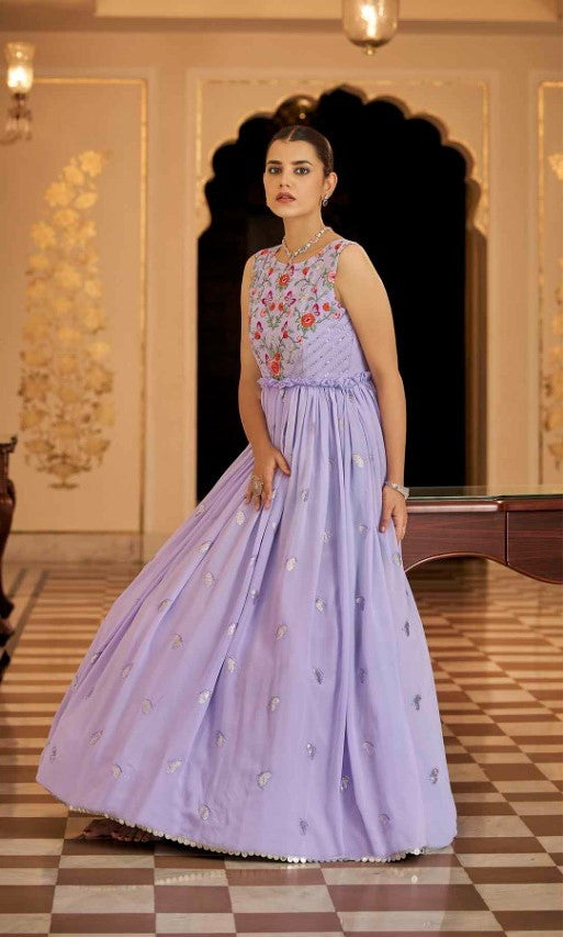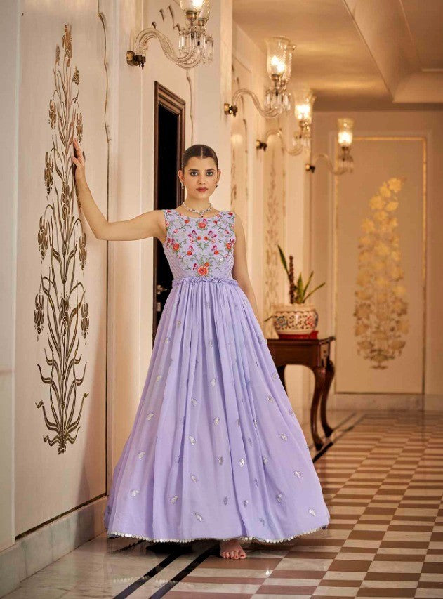 Semi-Stitched Stylish Lavender Floral Embroidered Georgette Long Gown