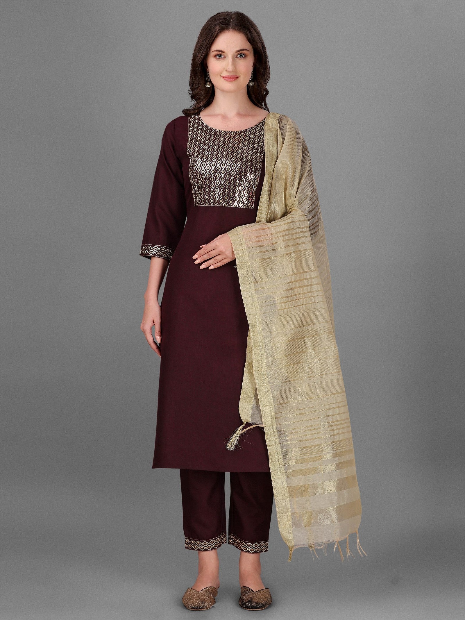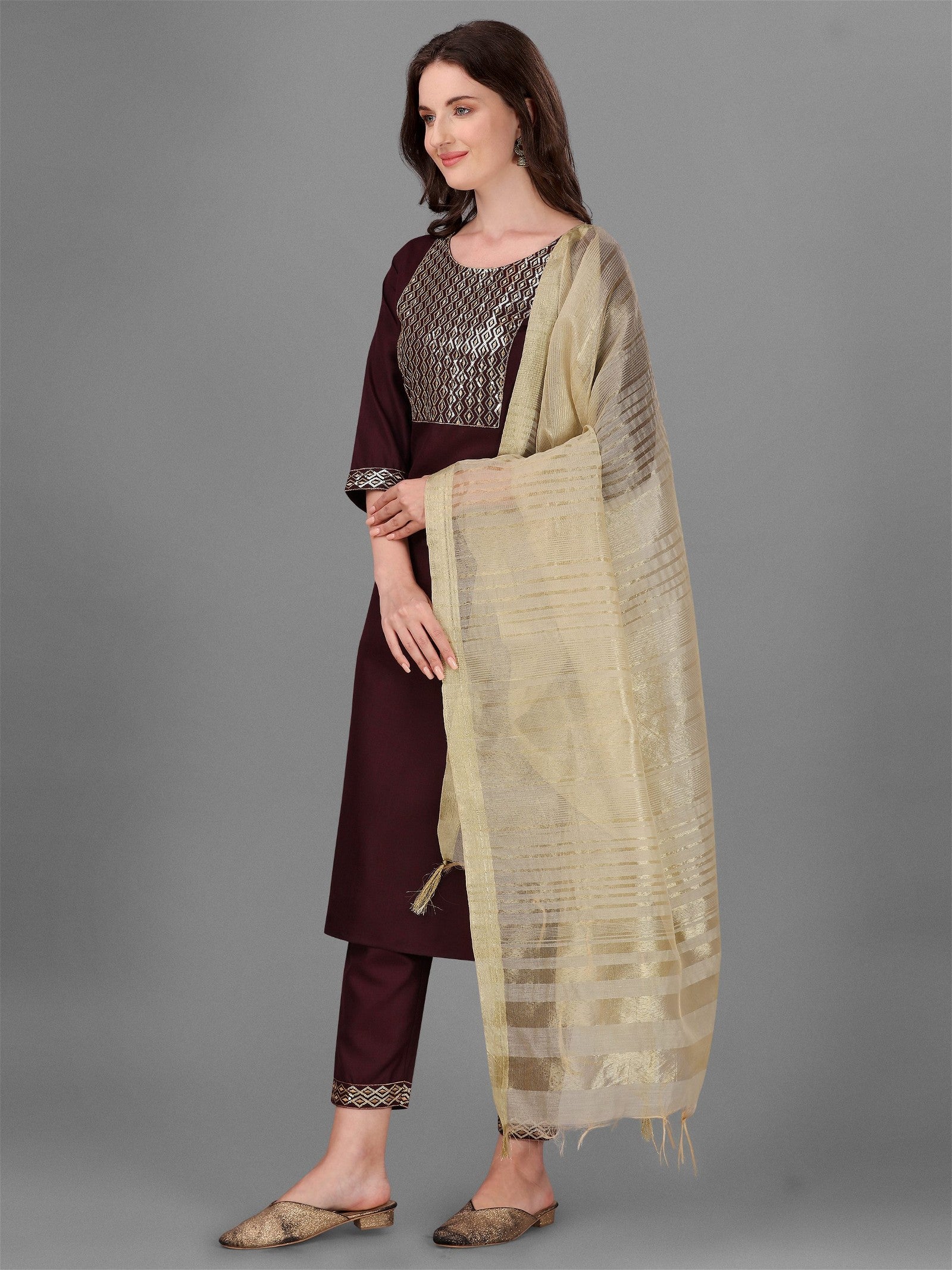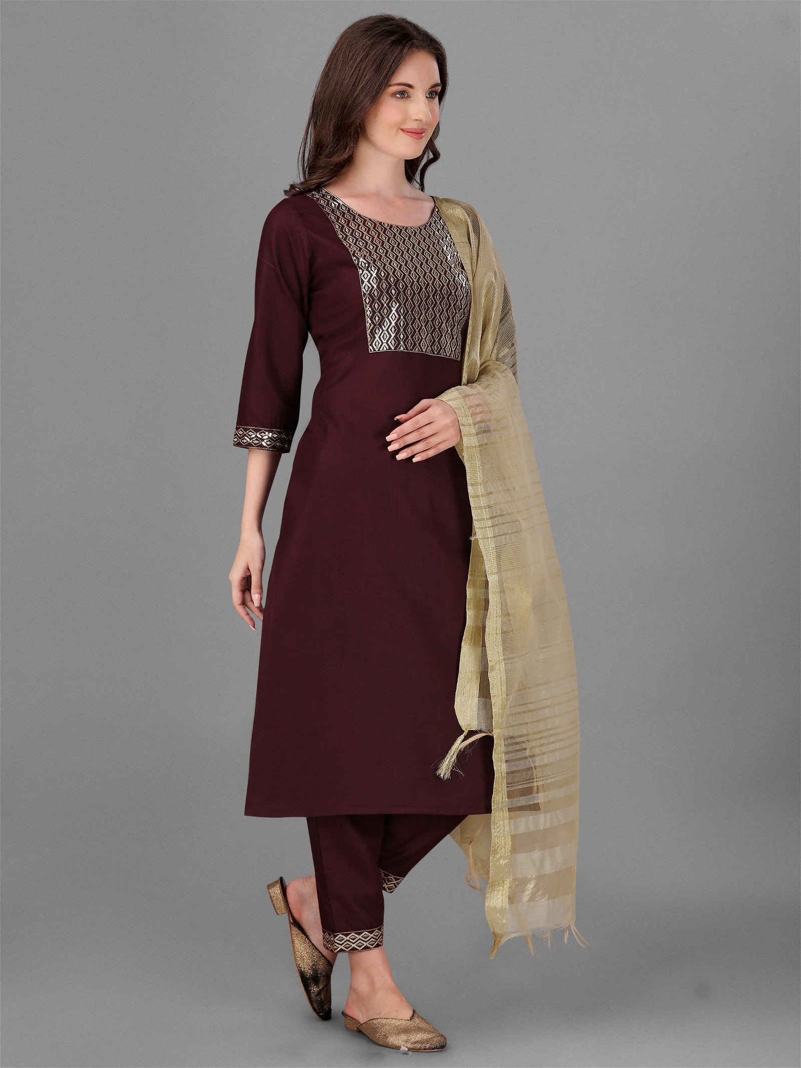 Womens Maroon Colour Cotton Kurta Pant With Dupatta Set